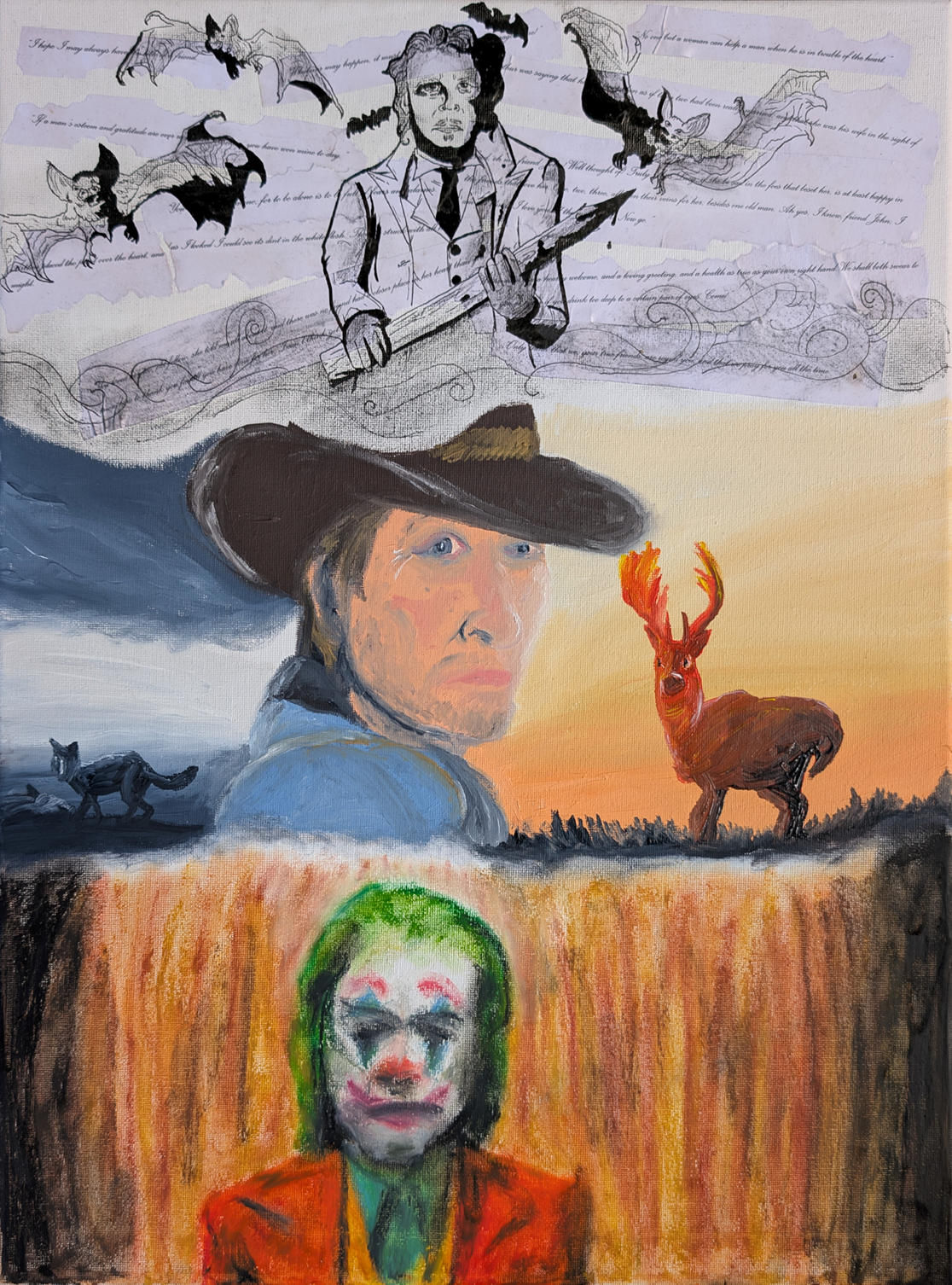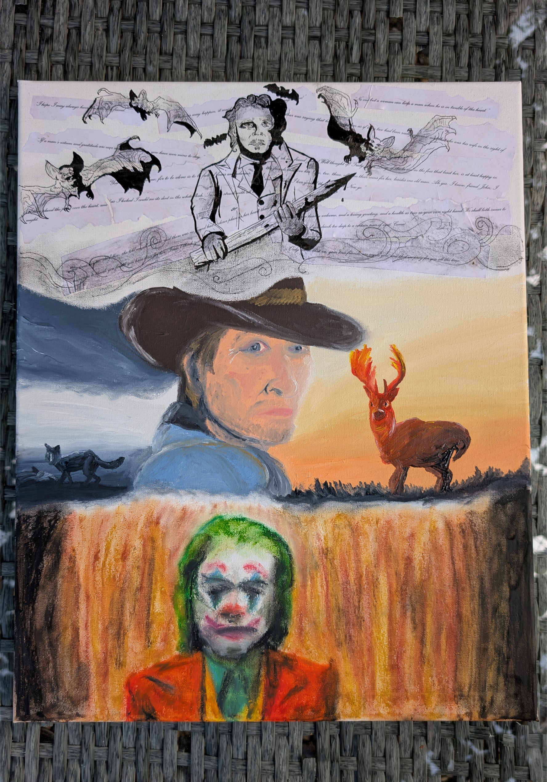 A triptych of three characters named Arthur from good to evil in three different materials: Arthur Holmwood from Dracula (pen and charcoal with paper collage), Arthur Morgan from Red Dead Redemption 2 (oil paint) and Arthur Fleck from Joker (oil pastel, lacquered). On canvas, no frame. Unique artwork, one-of-a-kind.