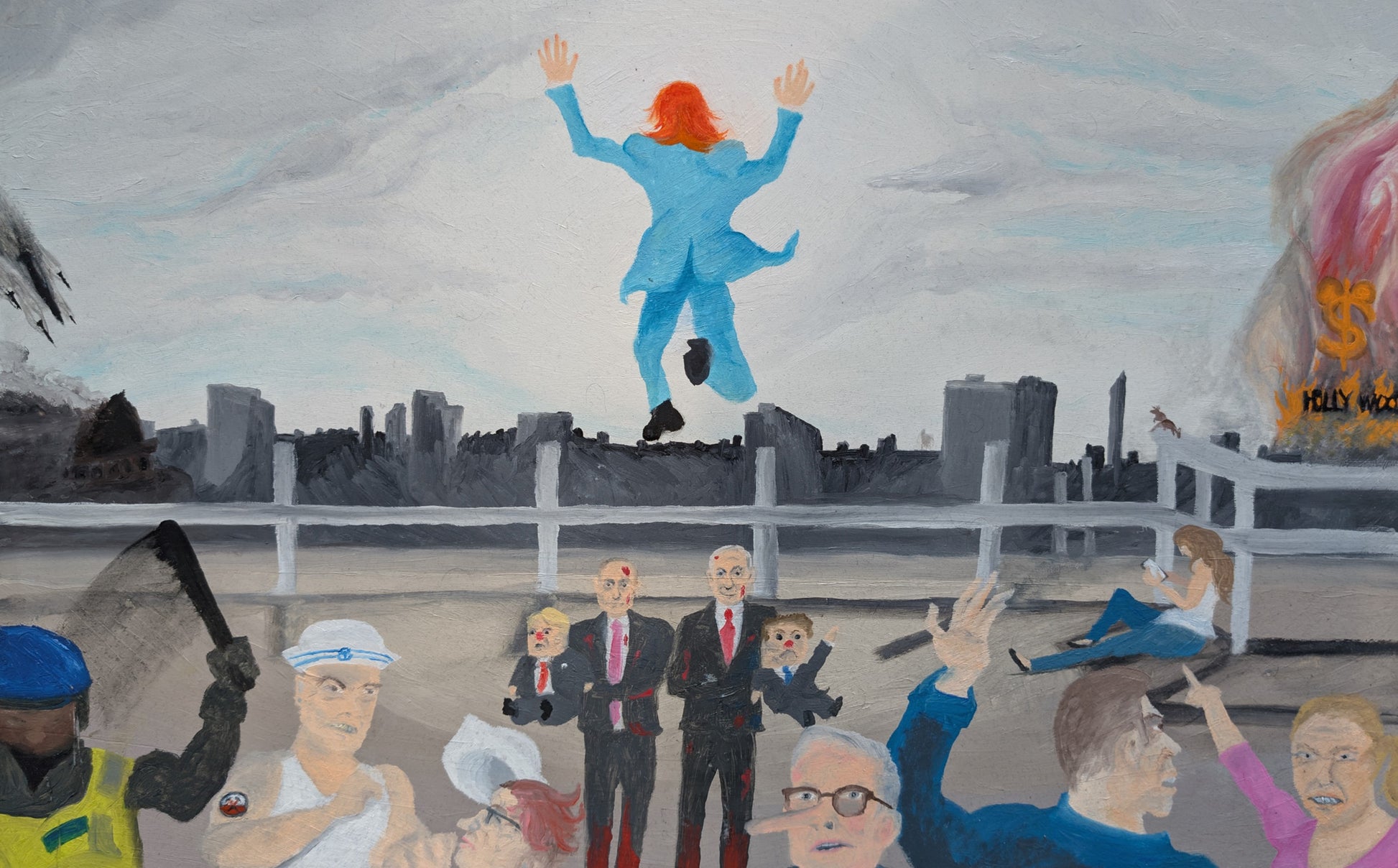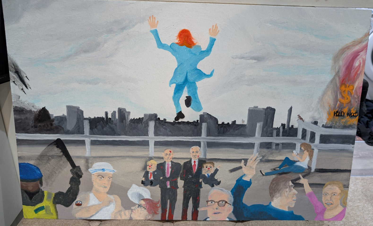 Large oil painting on wooden board. Unique artwork inspired by the David Bowie song and the BBC show. A satirical take on current events.